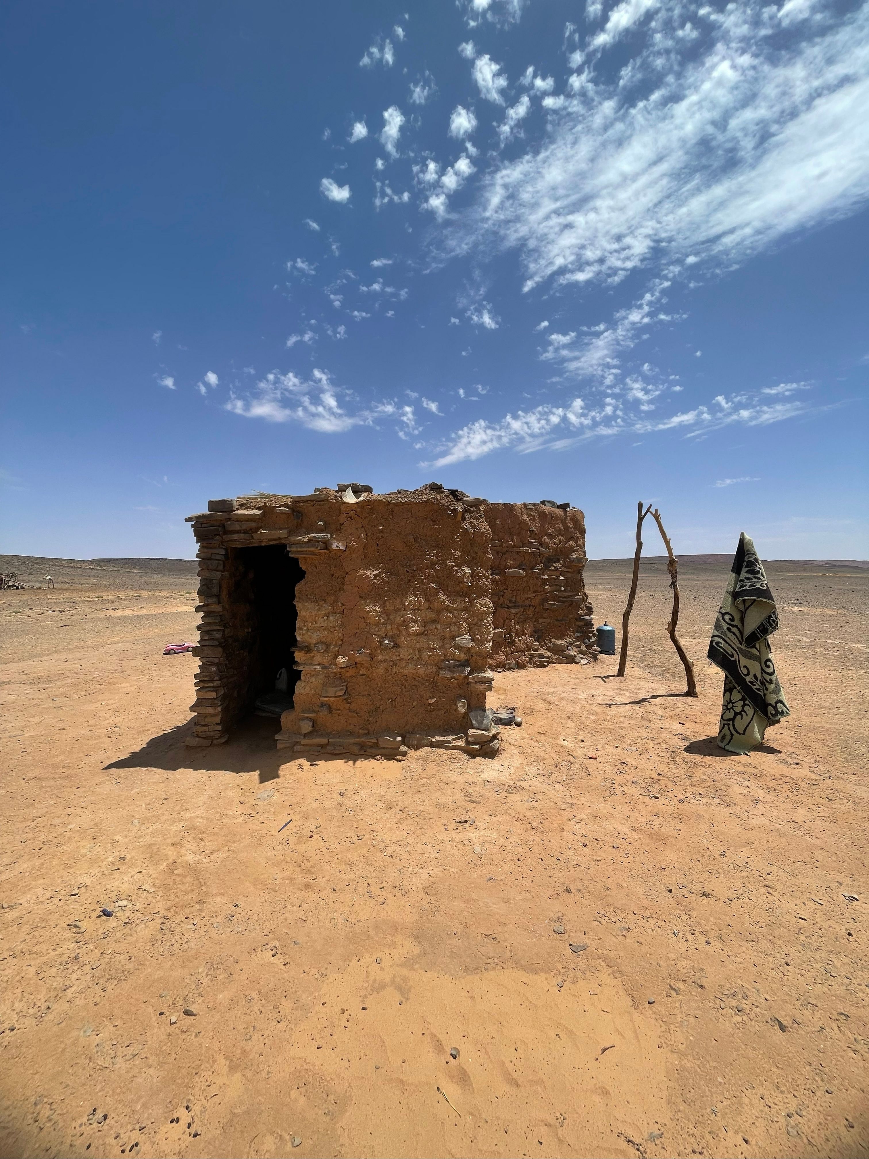 بيتٌ صغيرٌ في محيط بلدة حاسي لبيض. تعتمد بعض الأُسر نمط السكن المزدوج، بين الخيمة حينًا والبيت حينًا آخر.