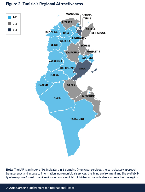 La constitution de 2014 consacre le principe de discrimination positive (à l’article 12), mais le concept n’est pas nouveau en Tunisie. Les incitations fiscales et les primes d’investissement en faveur du développement régional existent depuis les années 1970.13 Cependant, le processus de décentralisation est en grande partie conçu comme un moyen de remédier durablement aux disparités régionales de longue date en favorisant certaines régions par rapport à d’autres.