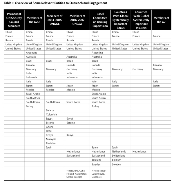 This declaration was later endorsed by heads of state at the 2015 G20 summit.8 Such general political commitments are laudable. Yet, history suggests that states often overpromise and underdeliver in upholding such broad normative declarations. One problem is ambiguity: states may differ in how they define critical infrastructure. There is also a growing number of experts expressing skepticism that the UNGGE process will be effective.9 Moreover, the language developed by the UNGGE focuses on the effects of cyber operations leaving a gap in the specific context of the highly interdependent global financial system. There is value, then, in seeking a more detailed agreement building on and clarifying this language in the context of specific operations that could be especially damaging to the international system.
