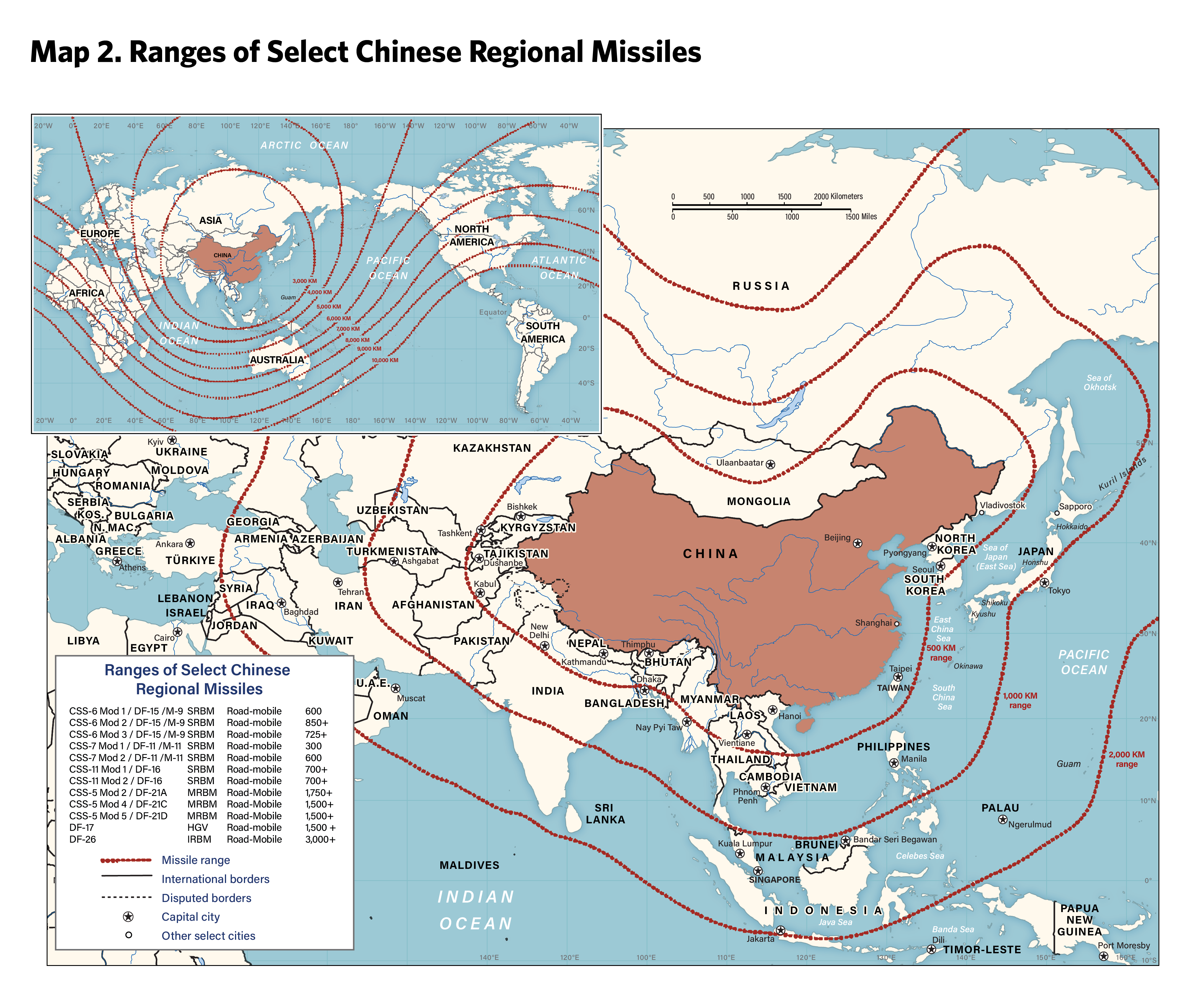 1 In general, short-range missiles are those with ranges between 300 kilometers and 1,000 kilometers, medium-range missiles are those with ranges between 1,000 kilometers and 3,000 kilometers, and intermediate-range missiles are those with ranges between 3,000 and 5,500 kilometers.