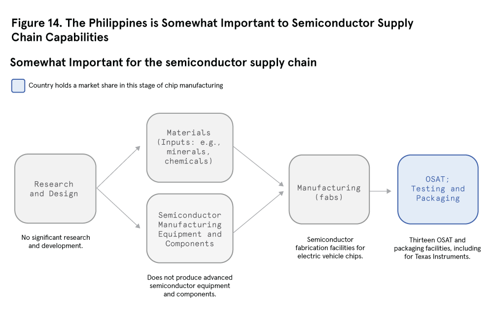 The United States and its allies currently dominate most cutting-edge chip design and manufacturing, but China dominates legacy chip production and is gaining ground with advanced chips. Our assessment of each ally’s importance in reinforcing American semiconductor supply chains is based on the size of the ally’s share of global manufacturing, machinery, materials, parts, and chip production capabilities for both cutting-edge and legacy chips. Given China’s dominance in outsourced semiconductor assembly and testing (OSAT), we place particular emphasis on allies that have OSAT capabilities. (We recognize that other U.S. allies such as the Netherlands make substantial contributions here, but they are outside our scope.)8