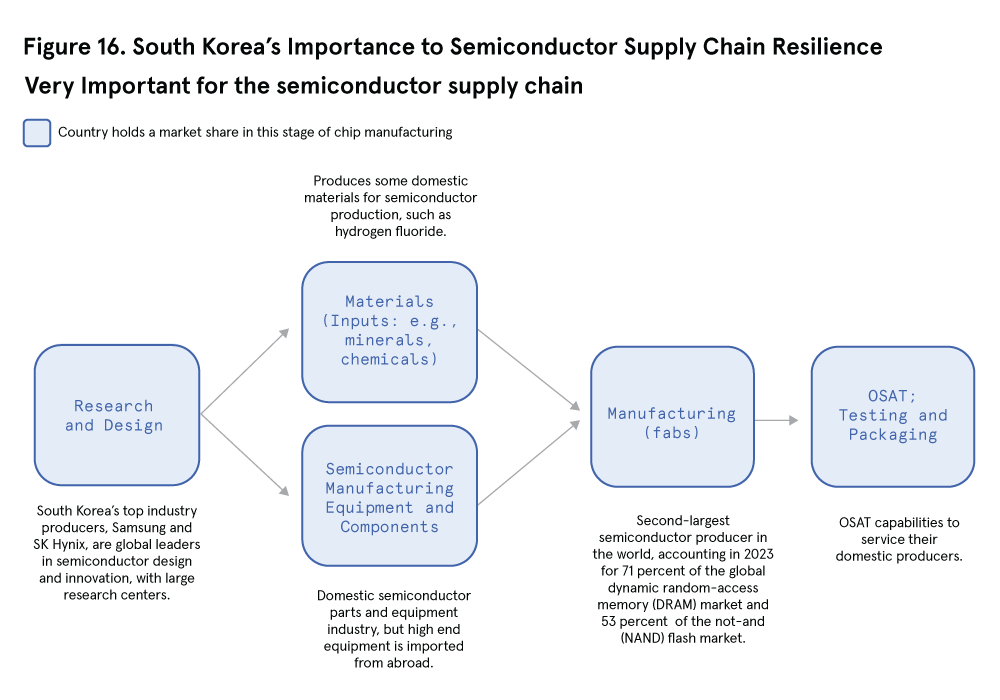 These three allies are also likely to be willing to assist the United States with friendshoring. While South Korea and Japan remain wary of antagonizing China, each aligned its supply chains with the United States in response to the 2022 CHIPS and Science Act and have taken legislative action to bolster their roles in the semiconductor supply chain through strategic investments.