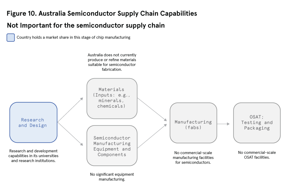 Australia is not an important ally for the United States in “friendshoring” semiconductor manufacturing supply chains because it lacks commercial-scale manufacturing facilities for semiconductors, relevant manufacturing equipment and OSAT capabilities.88 Australia also does not domestically produce and refine input materials necessary for semiconductors. Australia does possess research and development capabilities in semiconductor technologies in its universities and research institutions.89 National- and state-level initiatives are seeking to develop Australia semiconductor R&D capacity through industry and university partnerships. While U.S.-Australia collaboration under AUKUS Pillar 2 does not explicitly cover semiconductor supply chains, its goals for cooperation in advanced technologies including AI, quantum, and electronic warfare rely on securing semiconductor supply chains.90 Overall, Australia has little to offer the United States that would help it shift the production of legacy or leading-edge chips away from China.