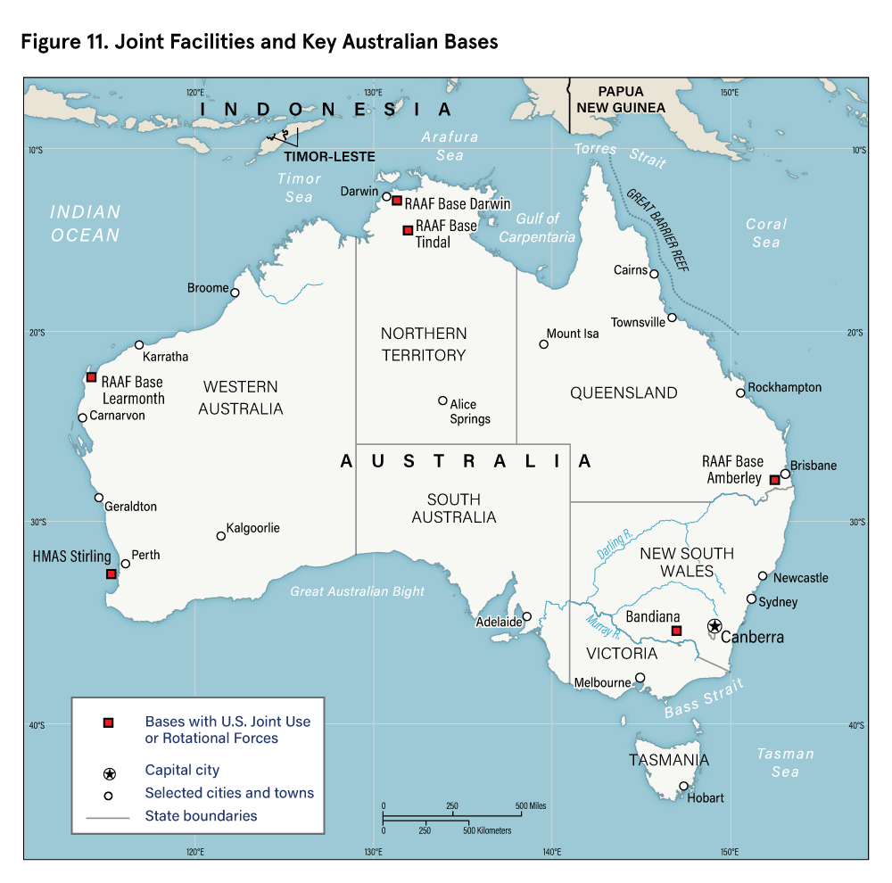 The 2021 launch of AUKUS was a key development,72 through which the United States will share advanced nuclear-propulsion and sonar technologies to co-develop nuclear-powered submarines.73 Following their ministerial consultations in 2023, Australia granted the United States additional access to its airbases and agreed to host U.S. submarines for “regular and longer” visits.74 The two countries also launched a Strategic Commercial Dialogue in 2022 with the aim of strengthening trade relations, cooperating on critical supply chains, and coordinating responses to common threats.75
