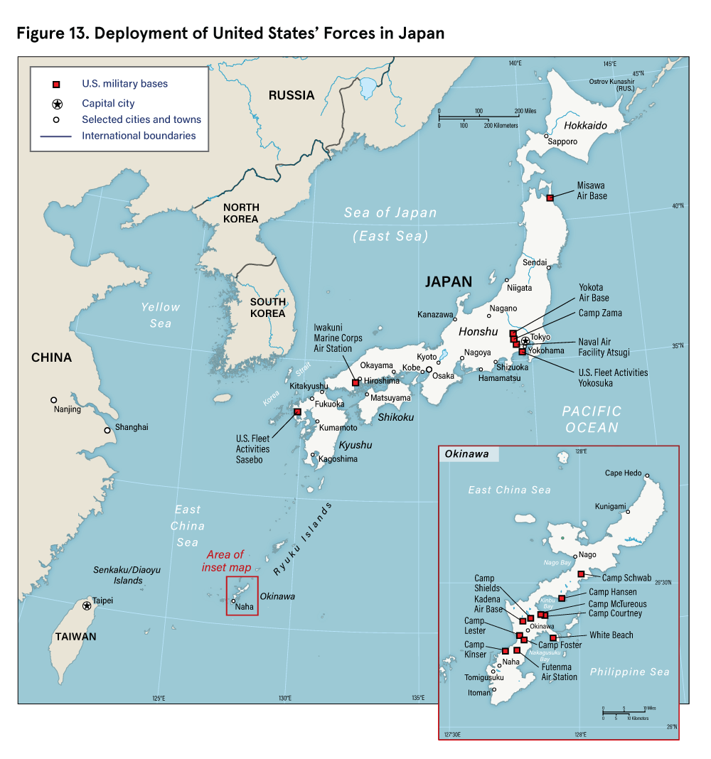 Japan is the United States’ most important Indo-Pacific ally, a core player in the semiconductors sector, a technological giant, the world’s fourth-largest economy whose military capabilities are expanding, host to critical U.S. bases in the region, and a key partner to the Global South. U.S.-Japan economic relations are very robust—with bilateral trade worth $227.9 billion in 2024—and they are each the largest investor in the other’s economy.159 Japan has increased its defense spending in response to China’s military aggression and political assertiveness, but the United States remains its main source of security. While public opinion is mixed on support to U.S. operations in the event of a crisis or war over Taiwan, Japan is likely to continue supporting U.S. diplomatic and military efforts to promote a “free and open Indo-Pacific” in response to a more assertive China.
