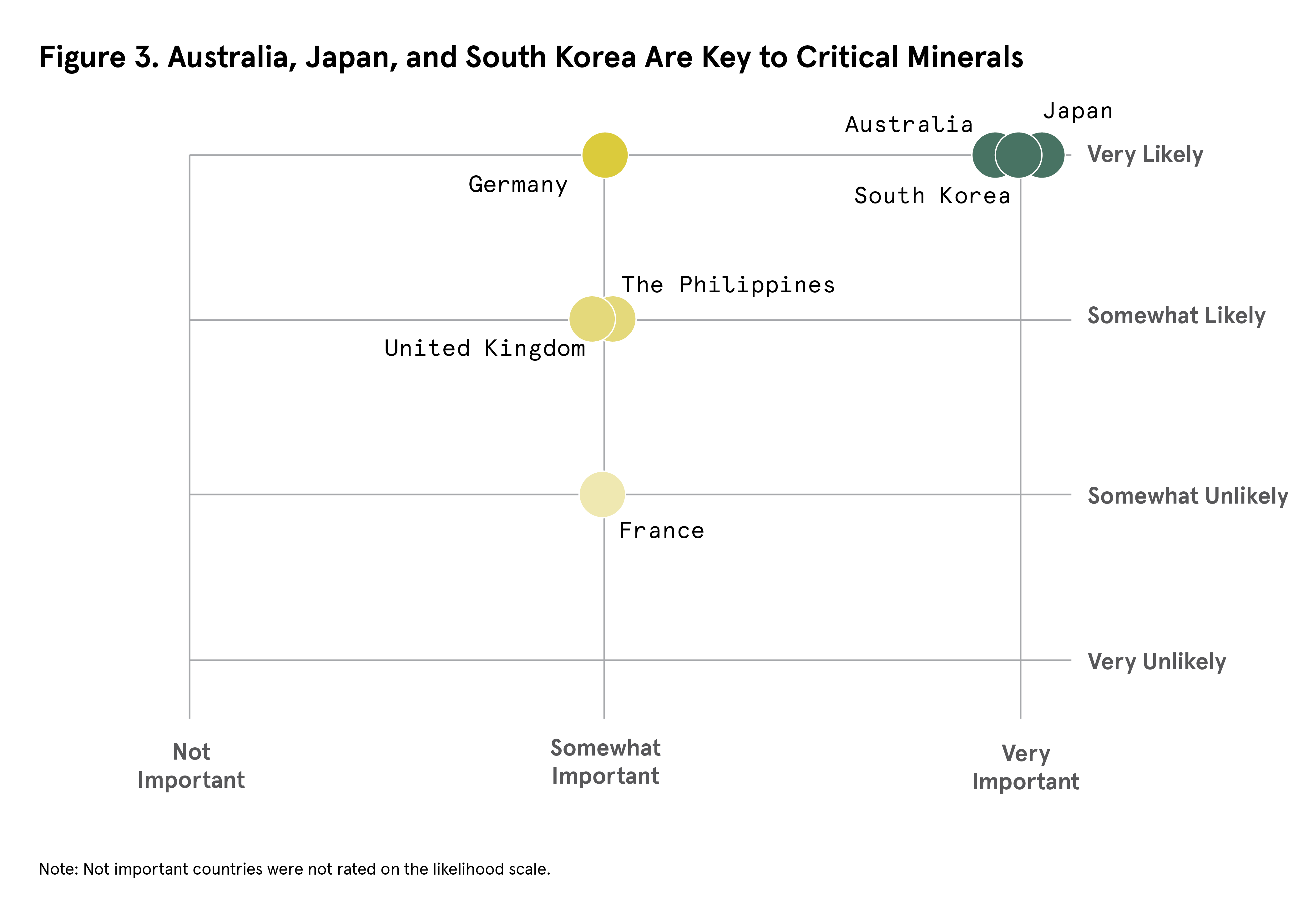 Given that these twenty minerals are all relatively scarce and are essential for manufacturing these applications, we do not distinguish between their comparative importance. Allies’ raw material contributions are crucial, as U.S. supply chains here are weaker than in chips and more vulnerable to Chinese leverage. To assess the extent to which allies can contribute to strengthening U.S. resiliency in this area, we focused on whether the ally had important critical minerals reserves, large-scale mining operations, or high-volume processing and refining capabilities.