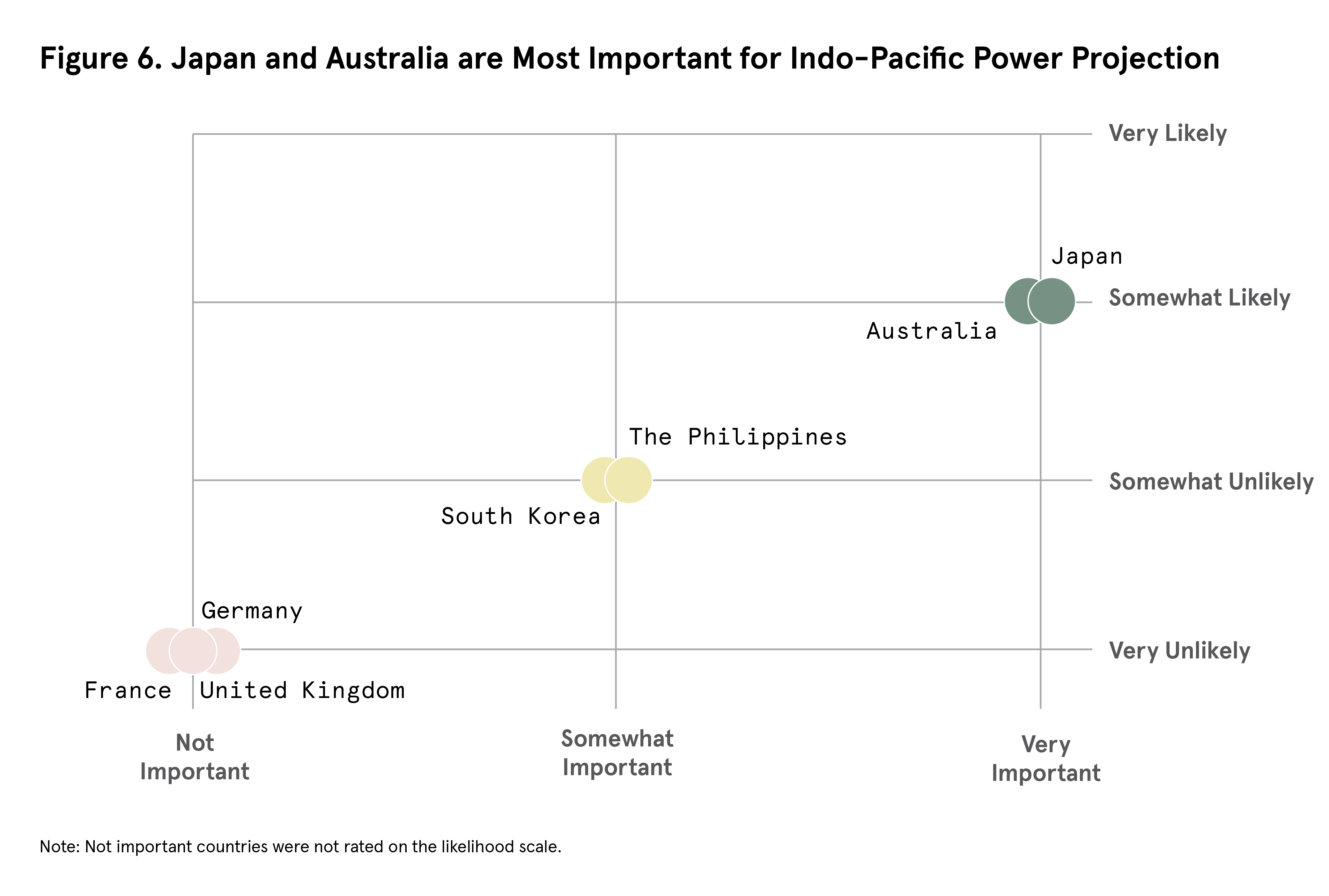 Japan and Australia both have a history of housing U.S. personnel or equipment, engage in consistent logistics coordination with the United States, and have native strike capabilities. Importantly, they would likely—although not certainly—offer support in the event of a war.