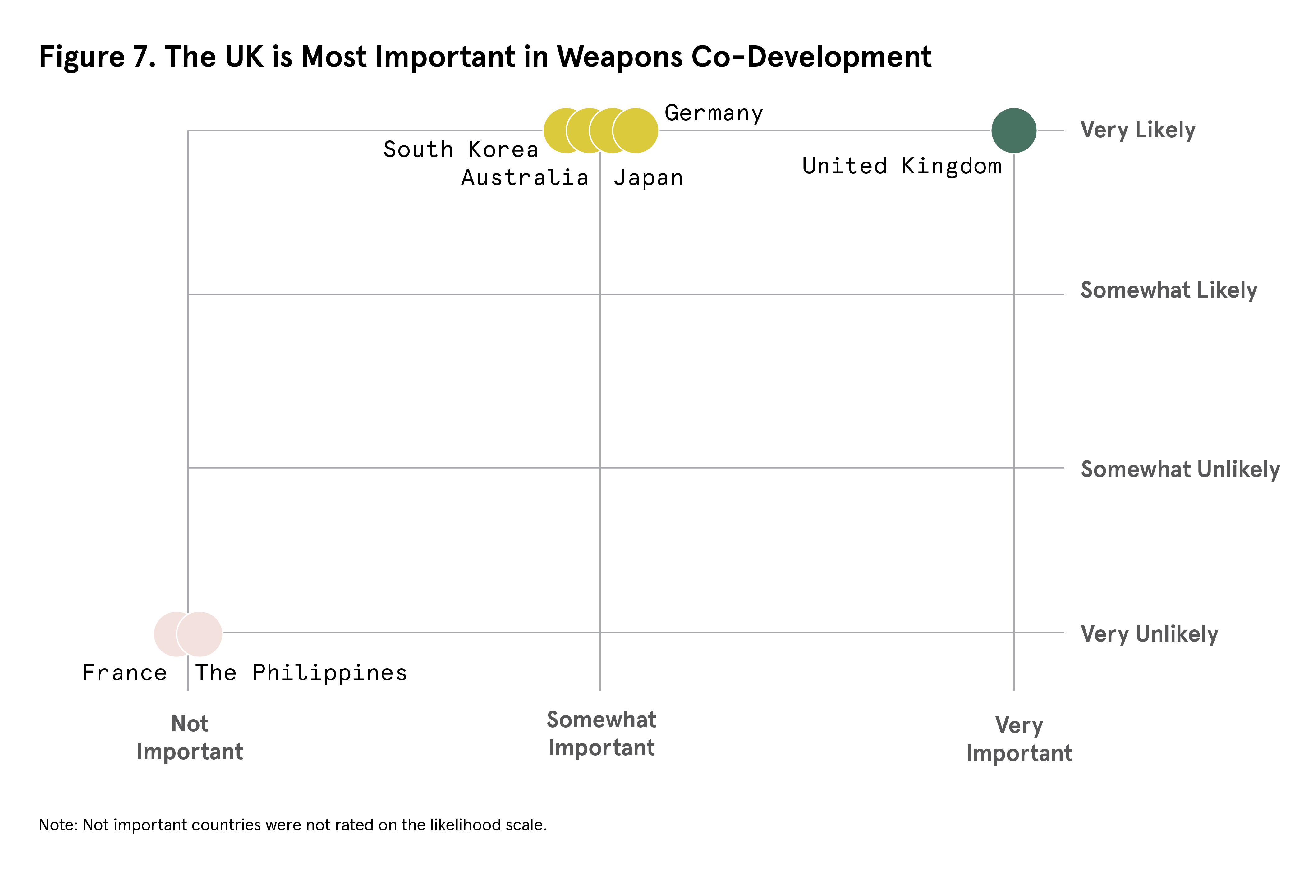 Australia is a somewhat important ally for the United States when it comes to co-developing military technology and adds value—but the United States would not be significantly disadvantaged if that cooperation were to end. There is collaboration across a wide range of advanced weapons systems including commitments to co-develop, co-produce, and co-sustain the PrSM, a next-generation long-range precision-guided missile for the HIMARS rocket system; co-producing and co-assembling GMLRS rockets in Australia by 2025; and co-producing M795 155 mm high explosive howitzer ammunition.133 Both countries’ governments and companies collaborate on the Guided Weapons and Explosive Ordnance Enterprise under which Australia has invested over $2 billion to acquire more long-range strike systems and manufacture longer-range munitions domestically.134 Australia also develops advanced aerial combat systems with the U.S. including the Integrator drone and the MQ-28 Ghost Bat autonomous “wingman” combat drone while Australian companies continue to participate in the production of parts for the F-35.135 Australia has also pledged to invest $3 billion in the U.S. submarine industry to support the timely delivery of the Virgina-class vessels it is due to receive.136