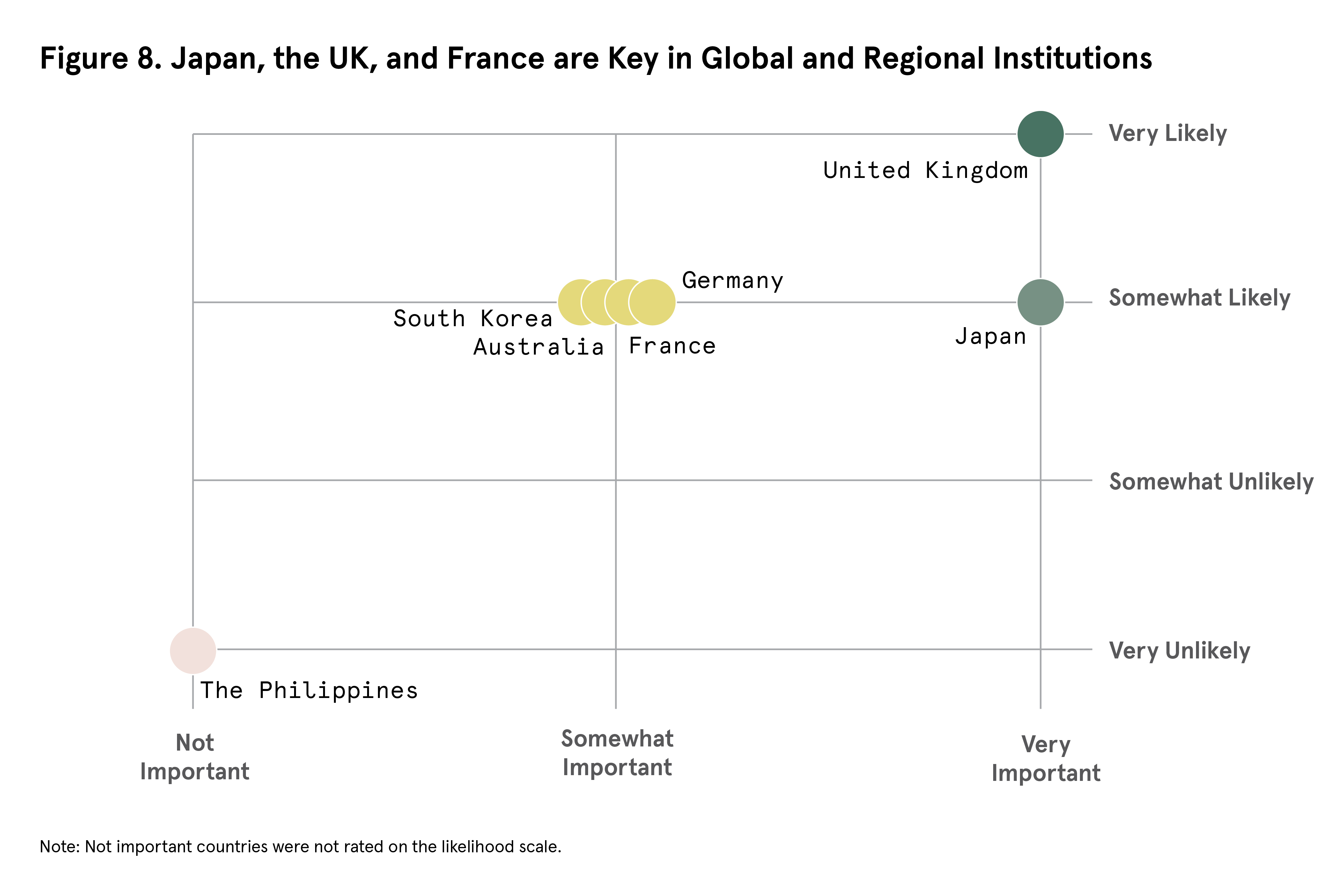 This report examines the capacity and will of seven key allies across these eight categories. The allies include the four major U.S. Indo-Pacific treaty allies—Australia, Japan, the Philippines, and South Korea—as well as its three major European allies—France, Germany, and the United Kingdom. We assessed each ally’s capacity and will to contribute concretely to the eight U.S. goals, assigning a value of “very important,” “somewhat important,” and “not important” in each case. These assessments are by nature subjective, but we have made every effort to ensure that they are congruent across the cases by adhering to clear definitions of what we mean by “very,” “somewhat,” and “not” important in each category—these definitions are provided in a section before the case studies.