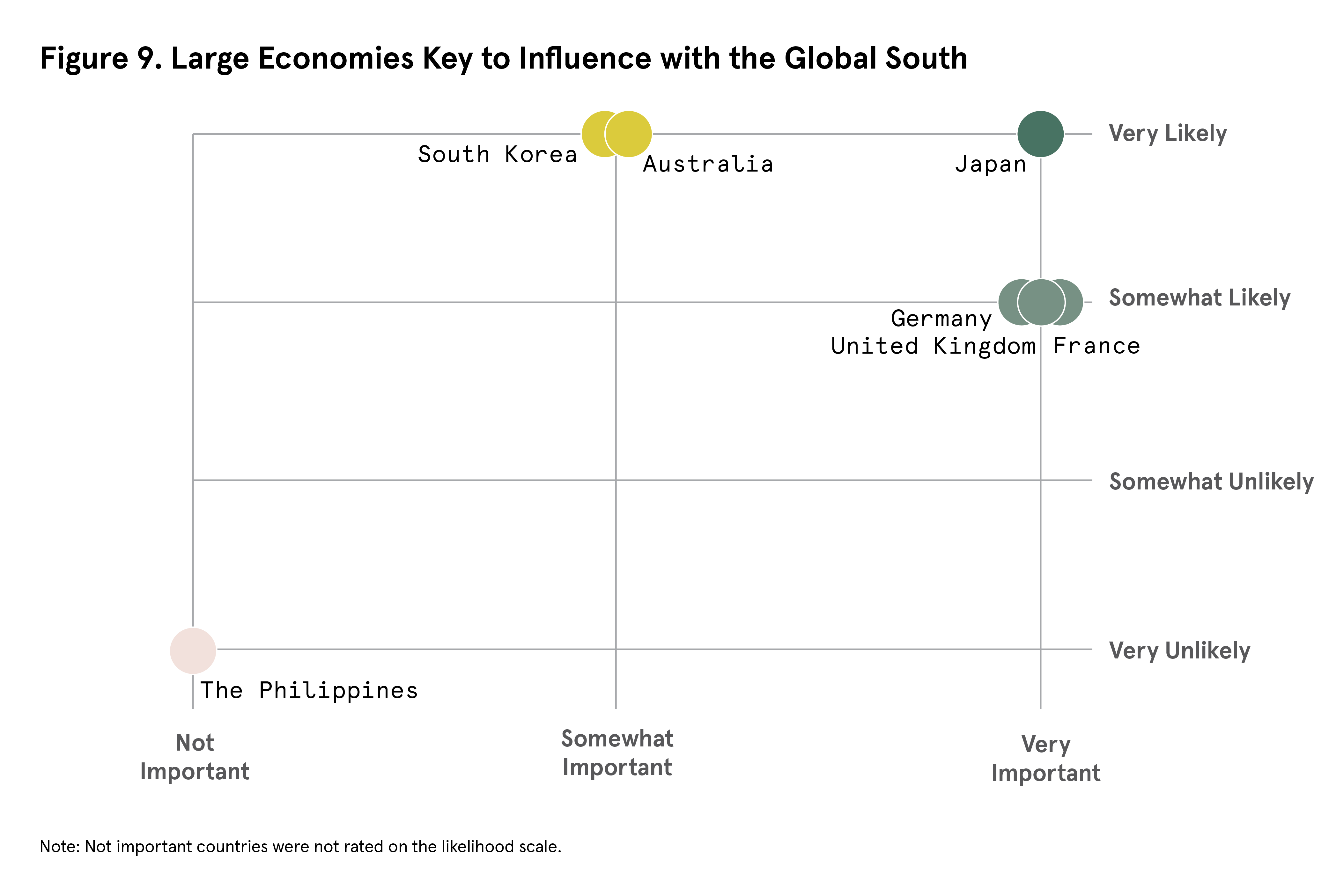 We estimate that Australia has some degree of relevant influence in third countries of the Global South, especially in the Pacific. It is the world’s fourteenth-largest provider of ODA, with a budget of $3.4 billion for this fiscal year.152 Australia has been especially active in its neighborhood, for example, by engaging with Pacific Island nations through $630 million in economic assistance over five years and police-training initiatives.153 It has focused on countering China’s expanding influence and security presence in the Pacific, as evidenced by its $118 million four-year funding package to train new Royal Solomon Police Force recruits that would “reduce any need for outside support” after the Solomon Islands signed a bilateral pact with China.154 It allocates the bulk of its bilateral development assistance to countries in its neighborhood. In 2023, it devoted $1.2 billion to countries in Oceania and $962.3 million to countries in Asia, making it a significant alternative to China for assistance there.155 It does not have a dedicated development finance institution, but the Australian Infrastructure Financing Facility for the Pacific (AIFFP) provides infrastructure financing through loans and grants to contribute to a “stable, secure, and prosperous Pacific.”156